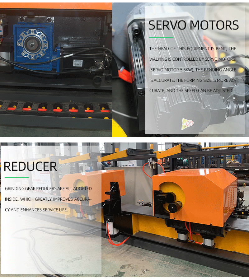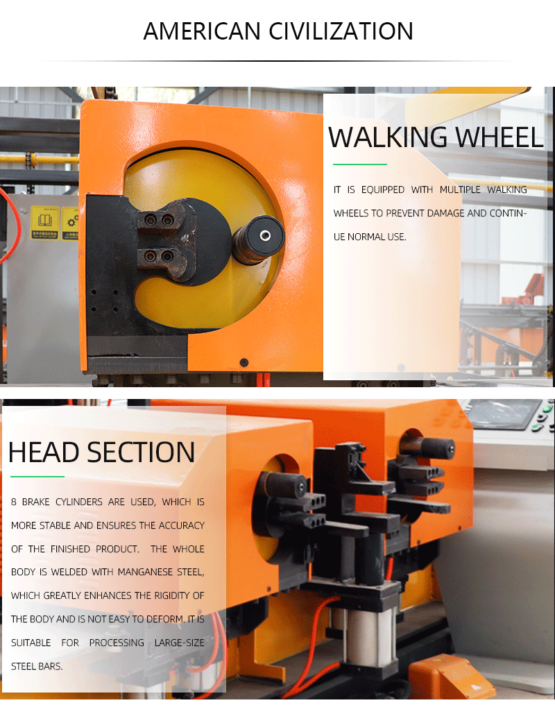 The CNC Double-heard rebar bender center adopts digital control. Its features simple operation, convenient maintenance and high efficiency. It can realize automatic length measurement, automatic bending clamp, rapid prototyping and other functions. The control program of imported PLC and CNC stores hundreds of figures and is equipped with database. It applies advanced designing concept and adopts imported servo motor driving and controlling. Therefore, it realizes two-way digital control bending and accomplishes more than 20 angles figures. The producing efficiency is high. This equipment especially applies to highway bridge construction site and rebar concentrated processing factory, etc.